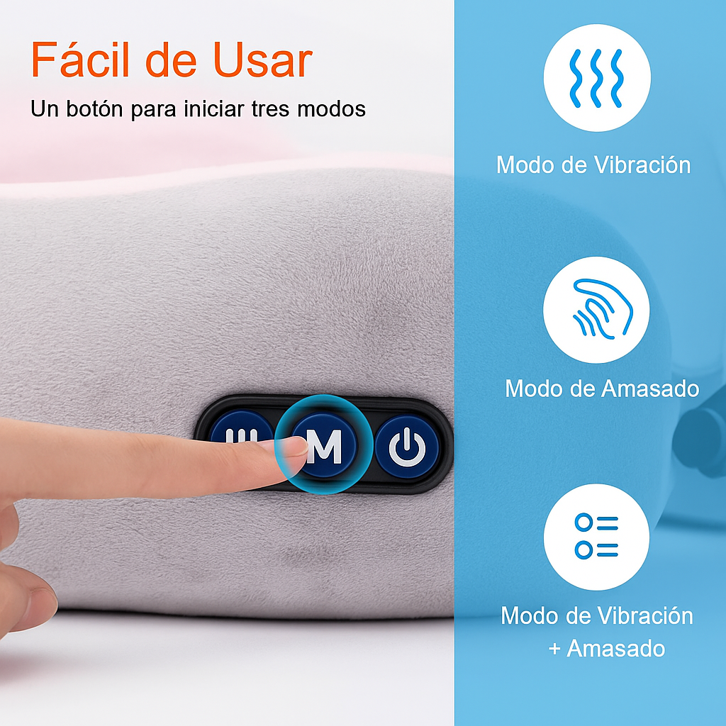 Cuenta con función de masaje y calor, ideal para relajar los músculos y aliviar tensiones durante viajes largos en avión, bus o auto. Su panel de control integrado permite ajustar fácilmente la intensidad, mientras que su funda de tela suave y transpirable garantiza una experiencia cómoda y agradable.